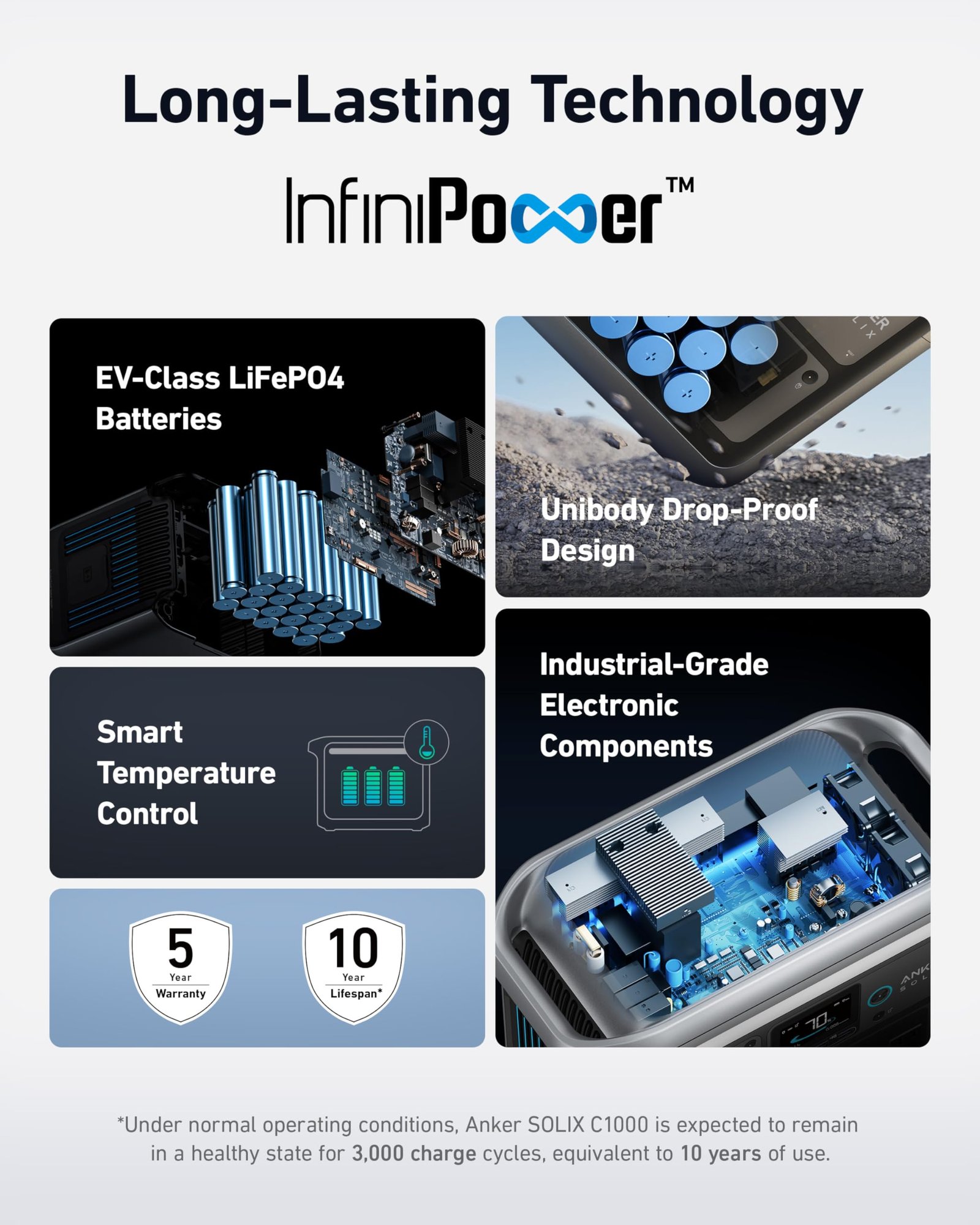 - Decade-Long Durability: LiFePO4 cells rated for 3,000+ cycles over a 10-year lifespan.
