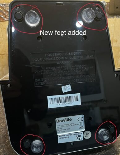 The most significant problem with the machine is the loud vibration that will shake a two cup setup apart resulting in spillage. Initially I reduced this by placing the cups on a folded paper kitchen towel. After experimenting the best solution is to buy a sheet of 22mm diameter x 10mm self adhesive silicone feet. This reduces the noise and vibration. (See pictures, use only 4 feet at the corners or the vibration will come back). A pity that Breville didn’t seem to detect the problem in the design stages and add deep silicone feet costing a few pence.