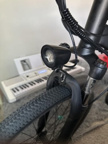 Further, I tested the front light as instructed by the user manual. To do so, I had to turn on the ebike, but the manual doesn’t mention how to do that at the point of installation. Yes, there is a red switch on the battery, but it took me a few minutes to figure out that I had to press and hold the power button on the LCD display as well. The manual should at least mention where to find the instructions on how to turn the ebike on or mention this early in the assembly section, not 5 pages further in on page 15 under Display Controls. Still, I managed to complete the setup of the bike after these minor hurdles. The bike includes front and rear disc brakes, 26-inch wheels, a locking front shock absorber, and a headlight. It weighs 49.6 lb, according to the manual. Despite its weight, I can reach over 21 mph in less than 10 seconds.
