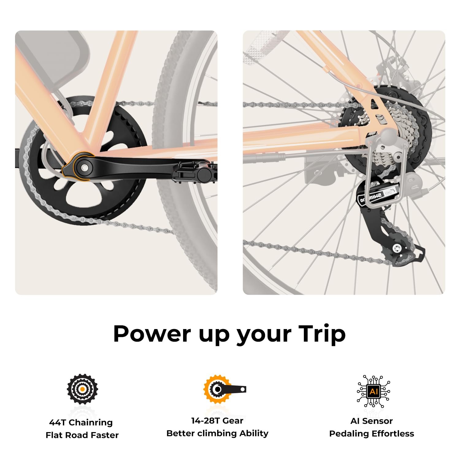 • 350 W (500 W peak) motor – instant torque for hills and 20 mph / 32 km/h cruising.
