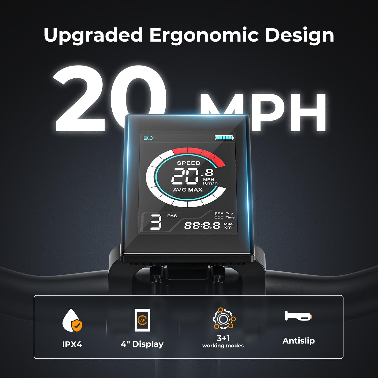 • Four ride modes – pedal, 3-level PAS, full-throttle & 4.5–7.5 km/h walk assist.