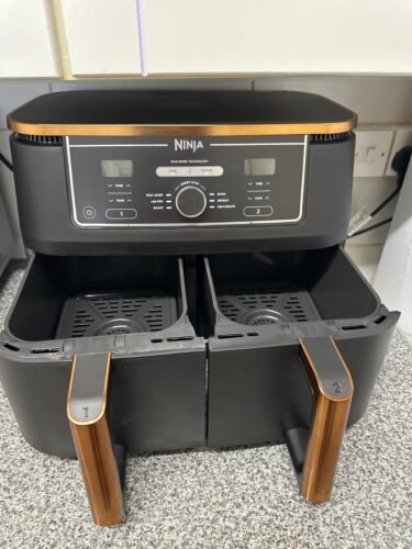 - What’s in the Box: Ninja Dual Zone Air Fryer, 2 x 3.8L non-stick drawers, 2 x crisper plates, UK plug, and a Chef-created recipe guide.