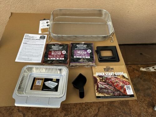 - Includes grill grate, crisper basket, grease tray with liner, thermometer, pellet scoop, and starter pellet packs