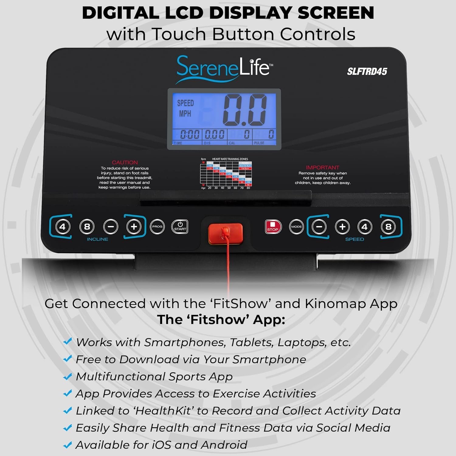 The SereneLife SLFTRD18 folding treadmill offers a smart, space-saving design with Bluetooth app connectivity via “FitShow,” a bright LCD touchscreen, and built-in hand-grip heart-rate sensors. Perfect for walking, jogging, or running, it supports up to 265 lbs and features 12 preset workouts plus manual speed and incline controls.