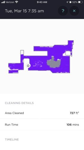 The bot cleaned for about 30mins, returned to base and emptied, resumed cleaning for another ~50mins, returned to base to empty and charge, resumed cleaning for another 50mins and returned to base to empty and recharge, declaring the job complete. I checked the app and although it says the map is not complete, it has covered 100% of the area I expect it to cover.
