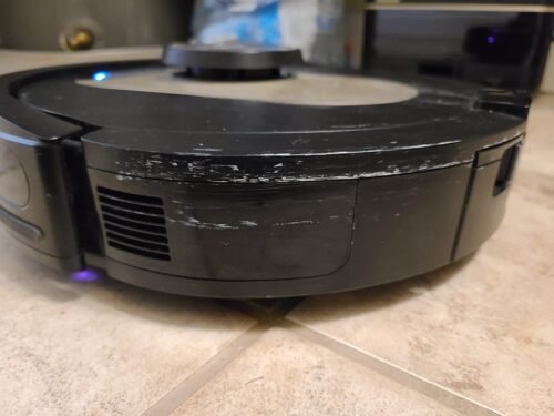 As shown in the pictures it has developed some scratches, scuffs, and gouges from trying to navigate in some tight corners. A few of our base boards have some stuff marks as well as the front of our range. We are getting some adhesive felt to go around the outside if the vaccuum to see if this helps.
