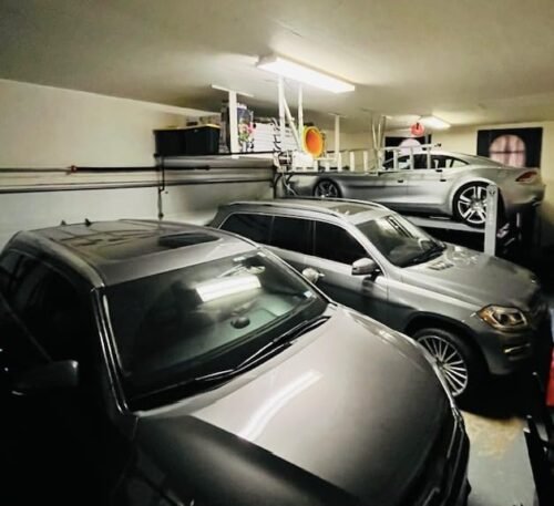 - I can get both cars in without the garage tracks being modified and I think this is mostly the case for lower-profiled cars. I will be installing the garage rails kit so I can open the garage door fully instead of halfway to slide in the bottom car. I did remove the mechanical garage lift and guide rail so I can lift any car to the 10'10" ceiling. I now lift the single-car garage door manually until I install the solution. Both SUV's fit easily without spacing issues through the double side door where that one is still motorized.