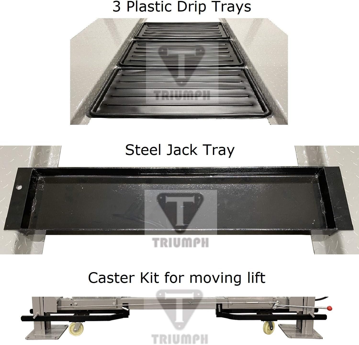 - Complete kit – Includes caster kit, aluminum ramps, jack tray, and 3 drip trays.